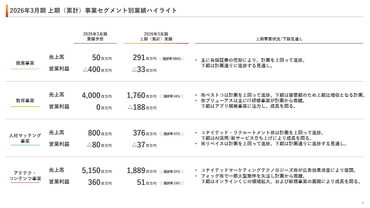 続いて、事業セグメント別の業績ハイライトについてご説明します。投資事業は、売上高2億9,100万円、営業損失3,300万円となり、有価証券売却により計画を上回りました。下期は計画どおり進捗する見通しです。