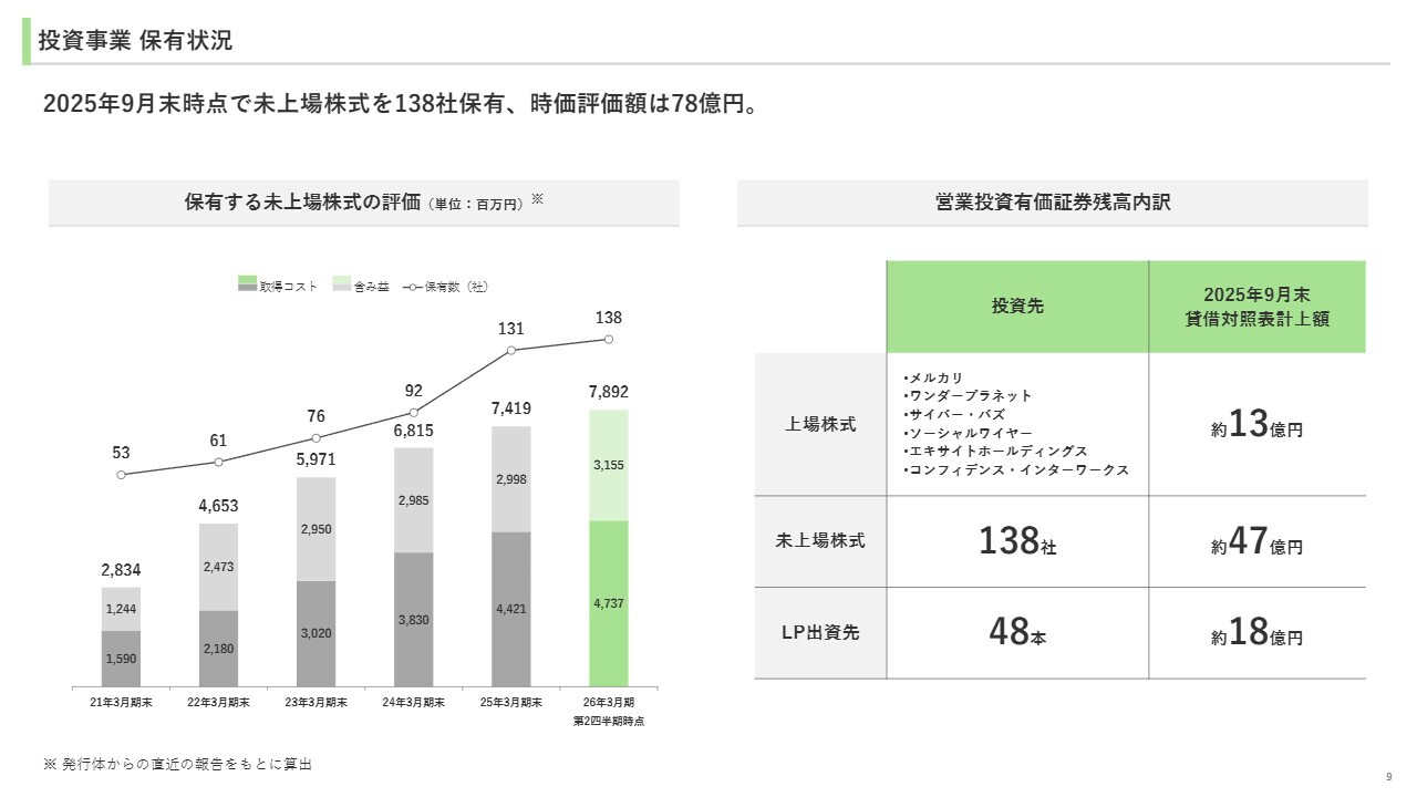 営業投資有価証券の保有状況についてです。2025年9月末時点で未上場株式を138社保有しており、時価評価額は78億9,200万円となっています。