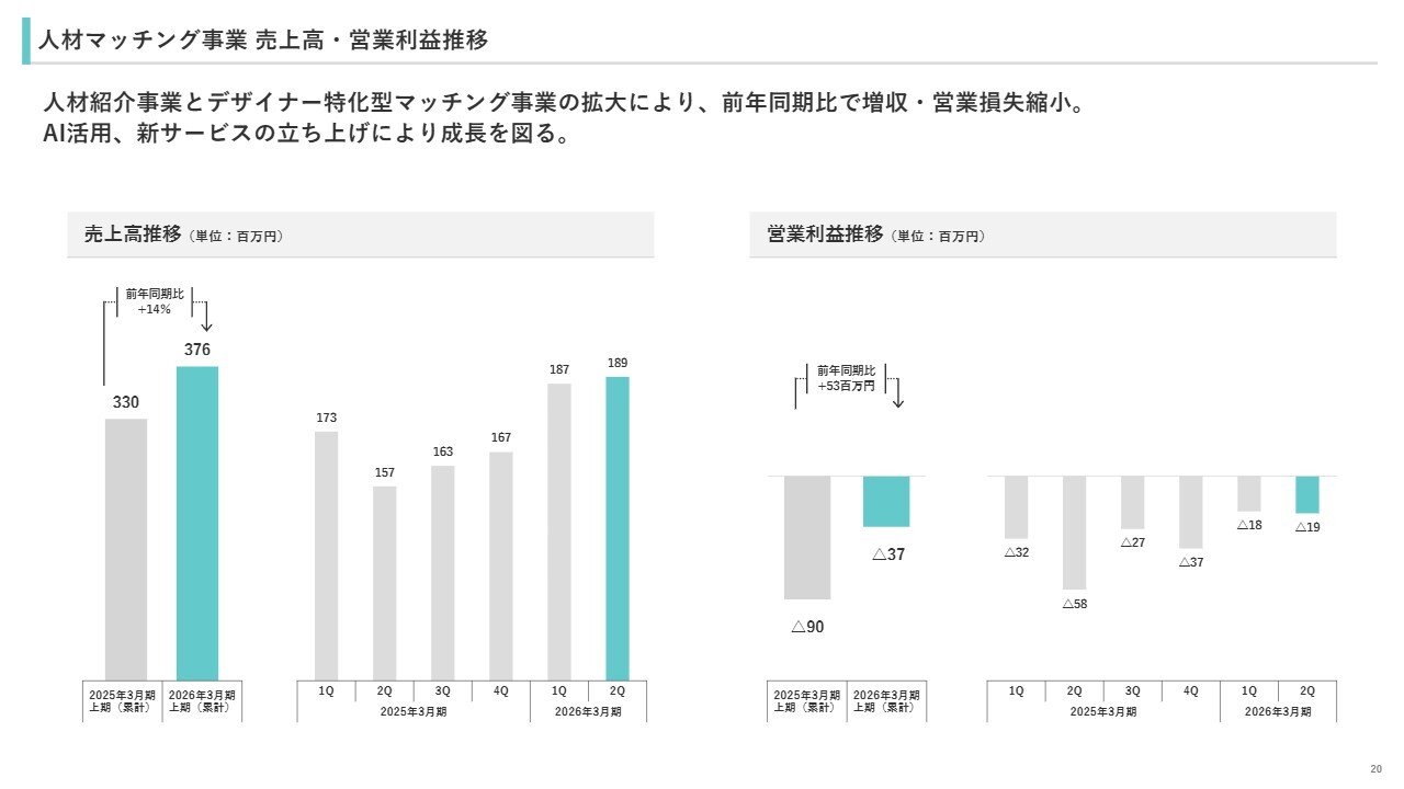 続いて、人材マッチング事業についてです。人材紹介事業およびデザイナー特化型マッチング事業の拡大により、前年同期比で増収となり、営業損失が縮小しました。