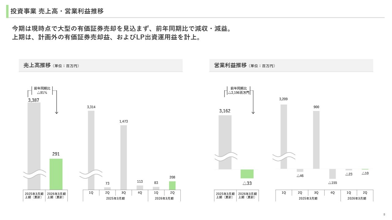 ここからは、各事業の概況についてご説明します。まず投資事業ですが、今期は現時点で大型の有価証券売却を見込んでいないため、前年同期比で減収減益となりました。