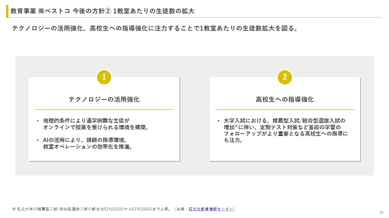 2つ目の方針は、1教室当たりの生徒数の拡大です。1つ目は、テクノロジーの活用を強化します。現在、地理的条件により通塾が困難な生徒向けにオンライン受講できる環境を構築することで、1教室当たりの生徒数の増加を目指します。