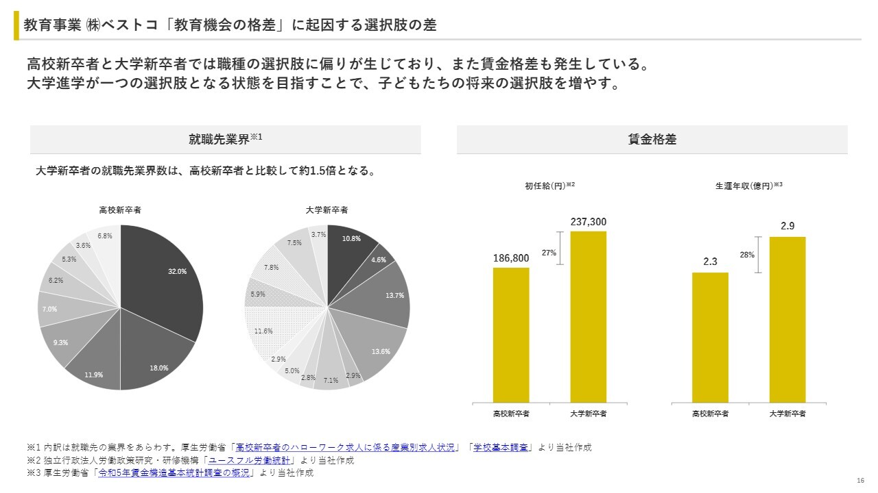 先ほどご説明しました「教育機会の格差」に起因して、選択肢の差が生じています。高校新卒者と大学新卒者の間では職種の選択肢に偏りがあり、初任給や生涯年収においても賃金格差が生じています。子どもたちにとって大学進学を選択肢の1つにすることを目指し、将来的な選択肢を増やしていきます。