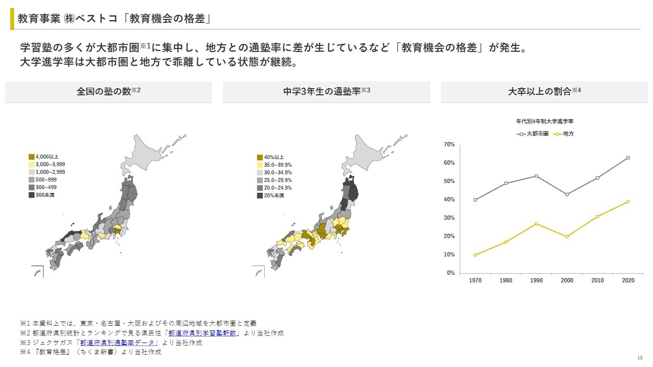 学習塾は多くが大都市圏に集中しており、地方との通塾率に差が生じています。また、大学進学率は全国的に拡大傾向にあるものの、大都市圏と地方では乖離が続いている状態です。