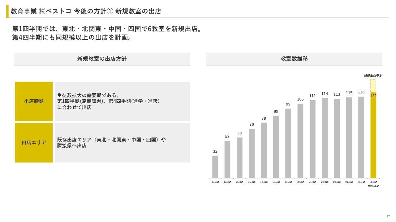株式会社ベストコの今後の方針についてです。まずは新規教室の出店です。第1四半期には、東北、北関東、中国、四国地方で計6教室を新規出店しました。第4四半期にも同規模以上の出店を計画しており、既存出店エリアや隣接県への出店を通じてエリアを拡大していきます。