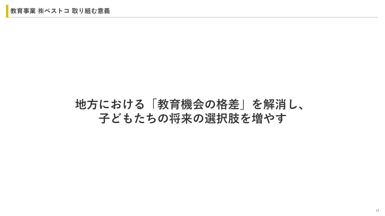 前期に連結化したベストコ事業について、その取り組みの意義をご説明します。ベストコ事業では、地方における「教育機会の格差」の解消と、子どもたちの将来の選択肢を増やすことを取り組みの意義としています。