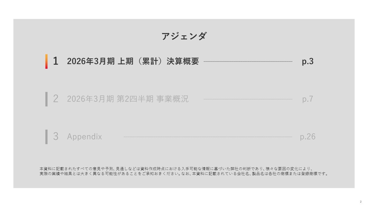 早川与規氏:ユナイテッド株式会社代表取締役社長兼執行役員の早川です。2026年3月期上期決算についてご説明します。スライドはアジェンダです。初めに2026年3月期上期決算概要、続いて2026年3月期第2四半期事業概況についてご説明します。