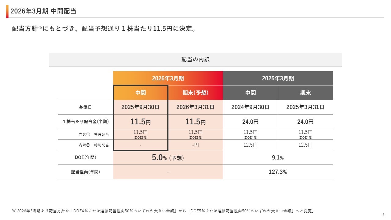 2026年3月期の中間配当についてご説明します。配当方針に基づき、中間配当は予想どおり1株当たり11.5円と決定しました。