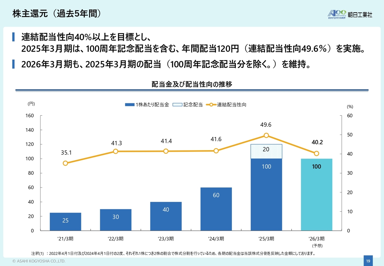 株主還元については、連結配当性向40パーセント以上を目標としています。2025年3月期は創立100周年を記念して、20円の記念配当を実施しました。2026年3月期も記念配当分を除いた配当額を維持しています。
