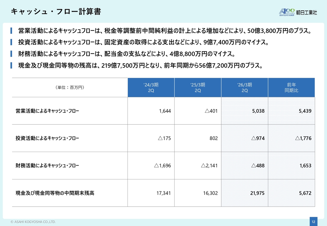 キャッシュ・フロー計算書は、スライドに記載のとおりです。