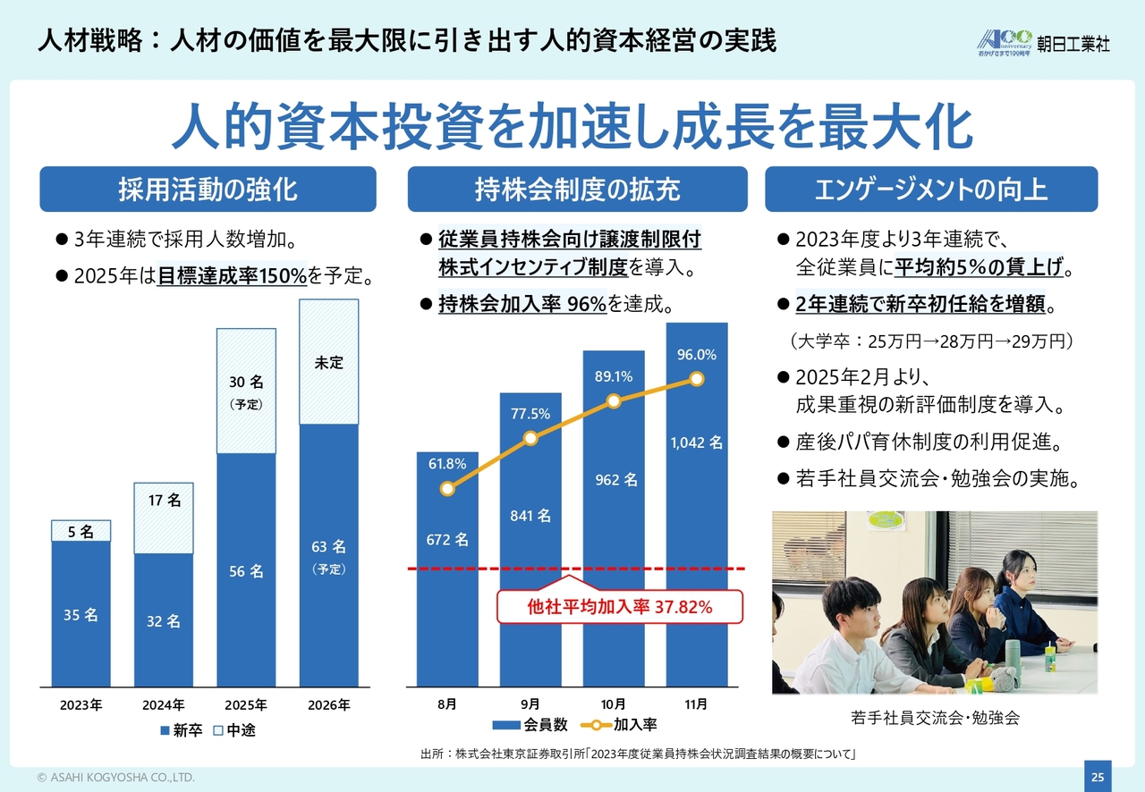 採用面では、3期連続で採用人数を増やしており、2025年度の目標達成率は150パーセントを見込んでいます。