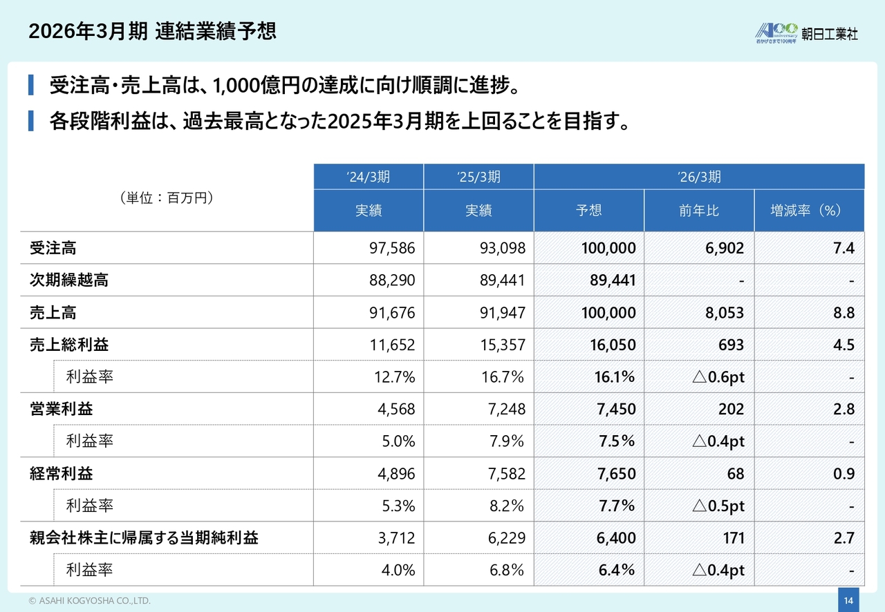 2026年3月期の業績予想についてご説明します。受注高については、国内製造業の設備投資意欲が依然として高く、受注機会が豊富であるため、2025年3月期を上回ると見込んでいます。