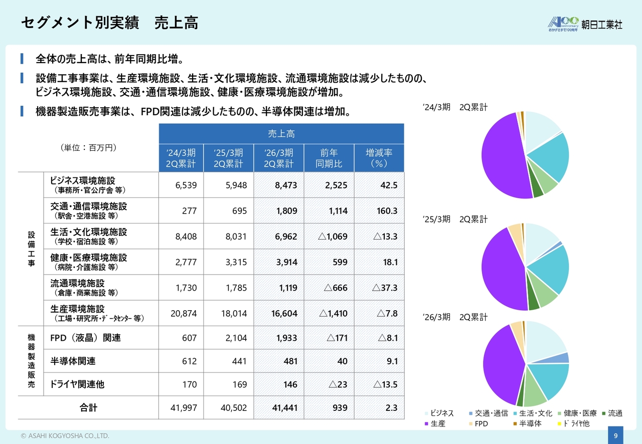 売上高全体としては前年同期から増加し、引き続き好調に推移しています。