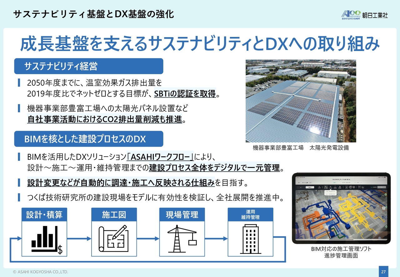 まず、サステナビリティ経営についてです。弊社は、2050年度までに温室効果ガス排出量ネットゼロを目標に掲げ、2025年度にSBTiの認証を取得しました。また、機器製造販売事業の工場には太陽光パネルを設置し、CO2排出量の削減に積極的に取り組んでいます。