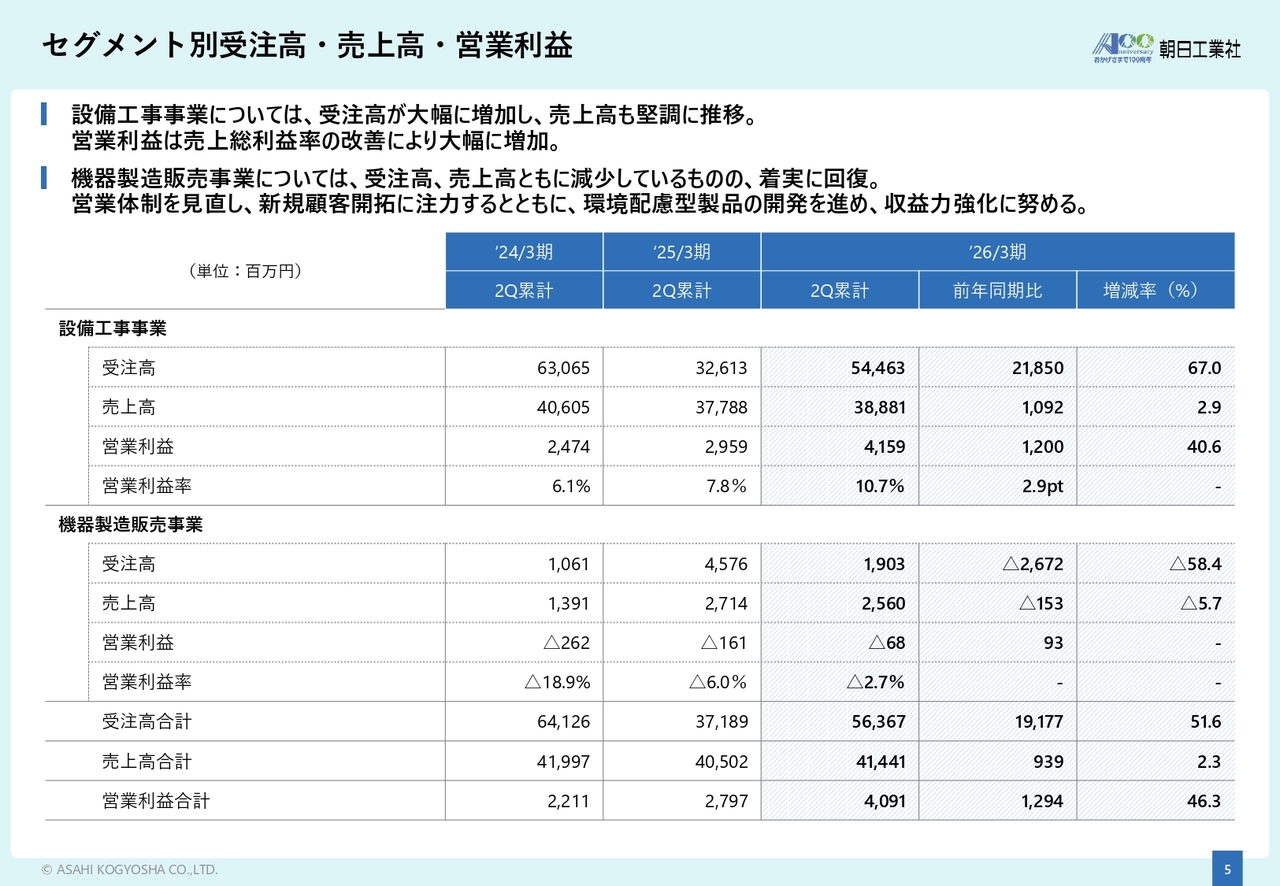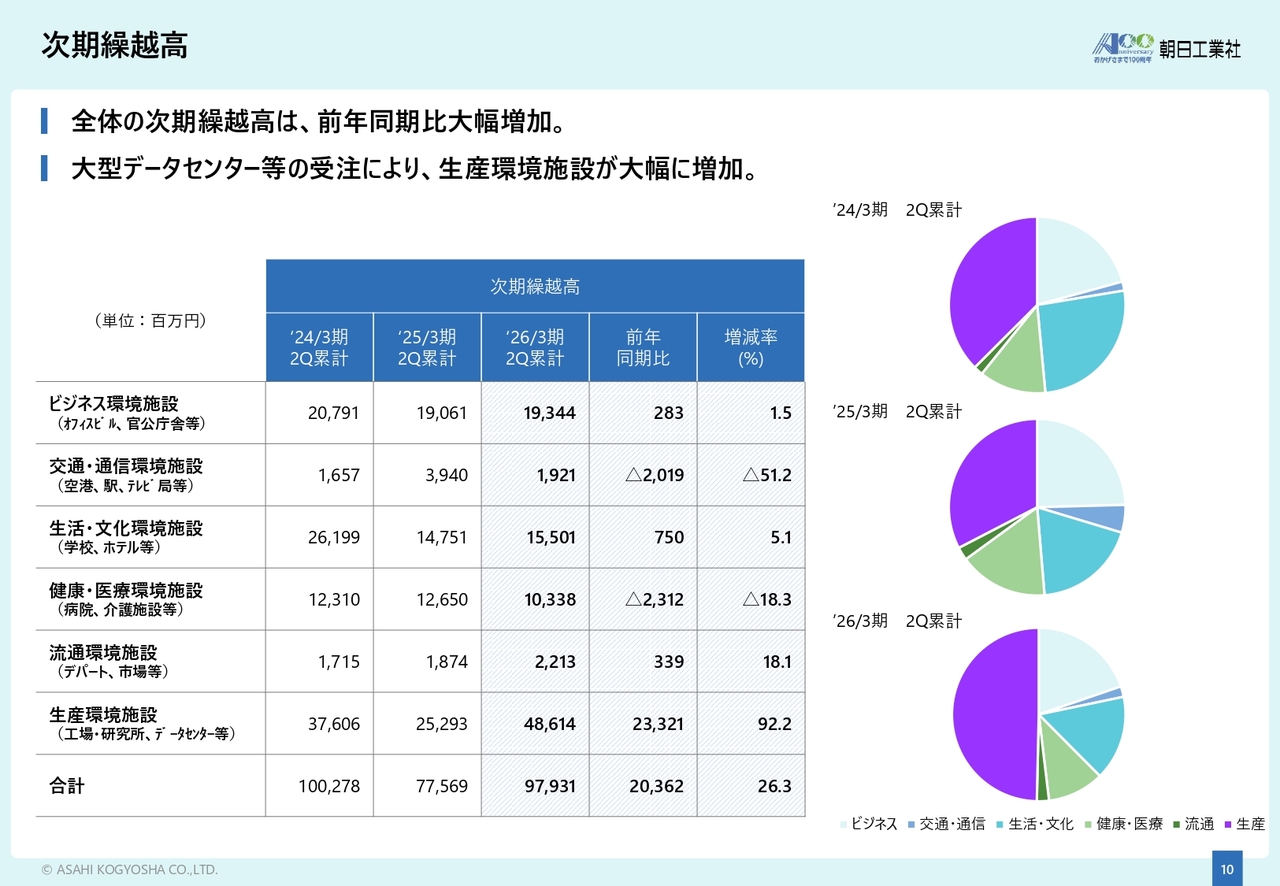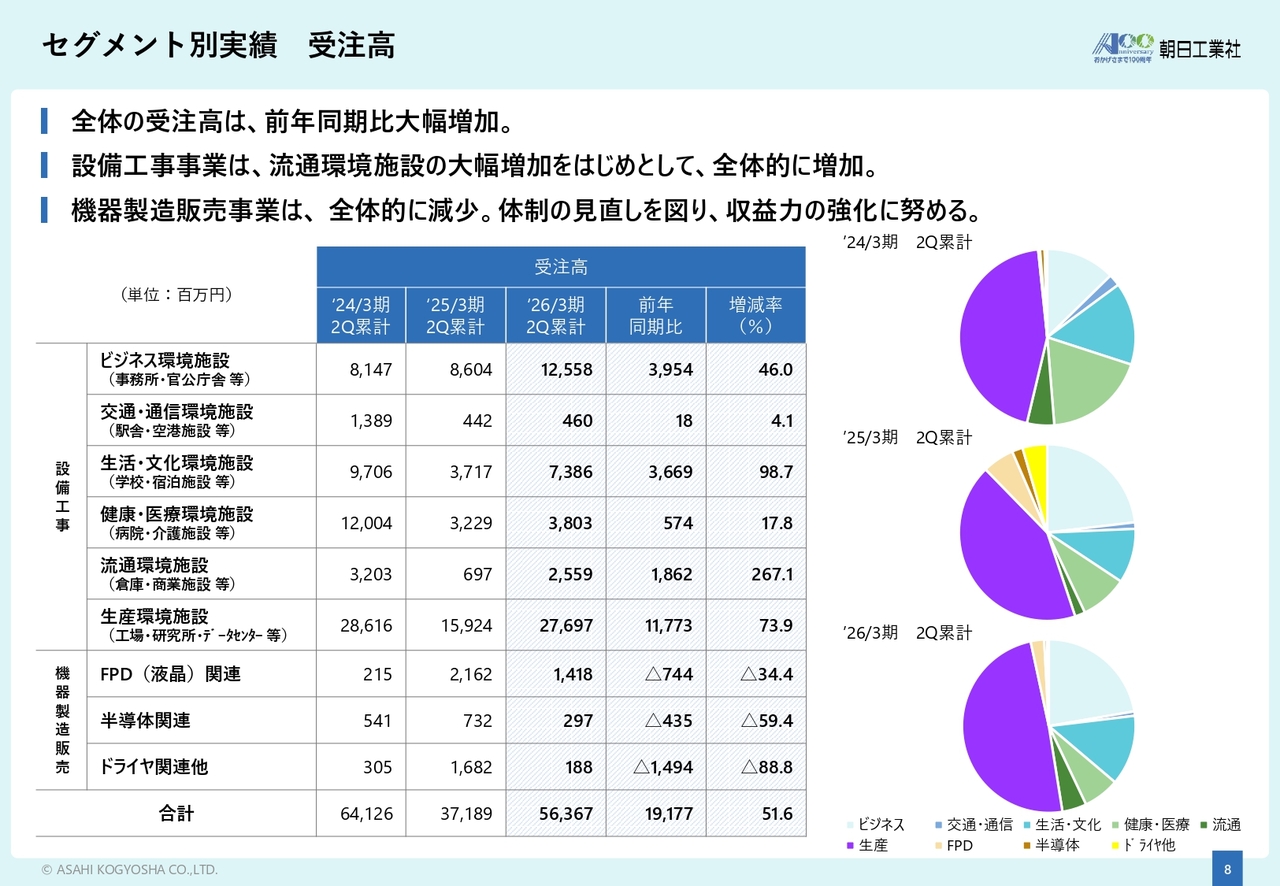 受注高全体としては、設備工事事業の牽引により、前年同期から大幅に増加しています。今後も大型半導体工場やデータセンターなどの計画が控えており、良好な受注環境が続く見込みです。