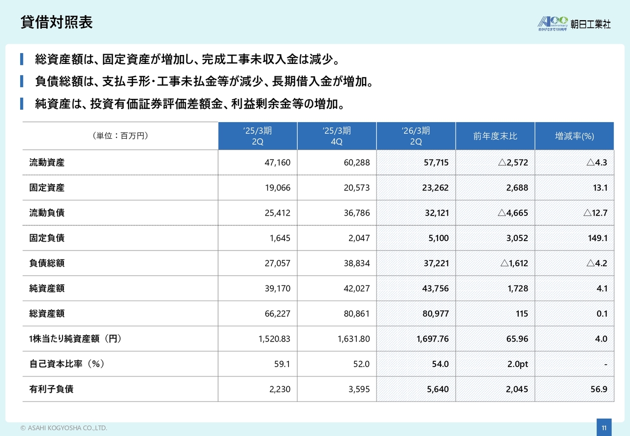 貸借対照表は、スライドに記載のとおりです。固定資産が増加していますが、これは茨城県つくば市に新設した「つくば技術研究所」の建設費用が計上された結果です。また、固定負債の増加は、主にこの建設費用に伴う借入金の増加によるものです。