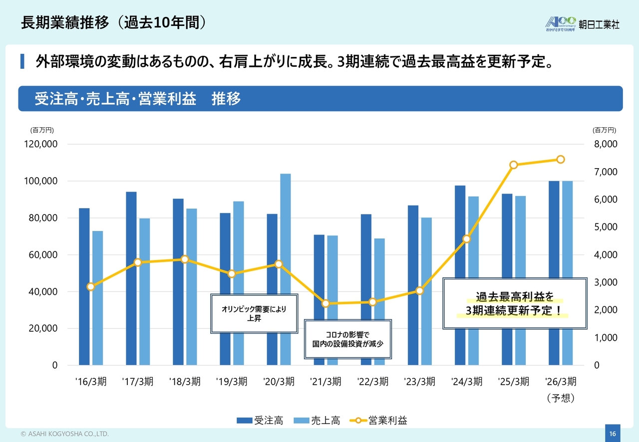 過去10年間で見た受注高、売上高、営業利益の推移についてご説明します。2019年3月期と2020年3月期はオリンピック需要もあり、売上高が大幅に増加しましたが、2021年3月期と2022年3月期はオリンピック需要の反動やコロナ禍の影響で若干落ち込みました。