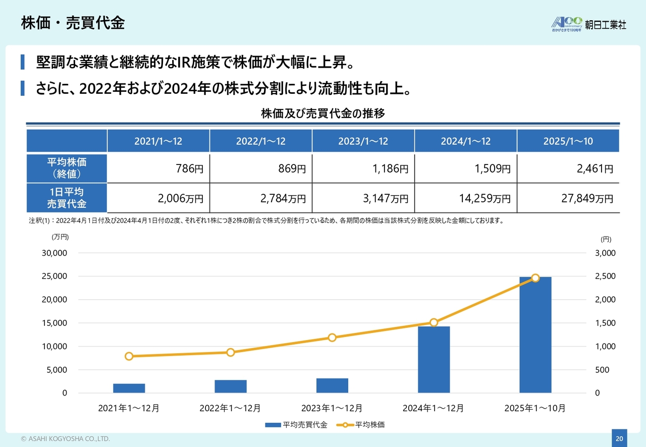 同様に、1日平均売買代金も2,006万円から2億7,849万円と大幅に増加しています。また、2022年と2024年の2度にわたって株式分割を実施し、投資単位を引き下げることで、投資家層の拡大と株式の流動性向上を図ってきました。
