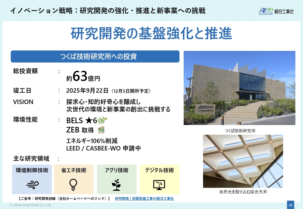 イノベーション戦略についてご紹介します。弊社の技術研究所はこれまで千葉県習志野市に所在していましたが、新たに茨城県つくば市に「つくば技術研究所」を建設しました。同研究所は、「探究心・知的好奇心を醸成し、次世代の環境と新事業の創出に挑戦する」ことをビジョンに掲げています。