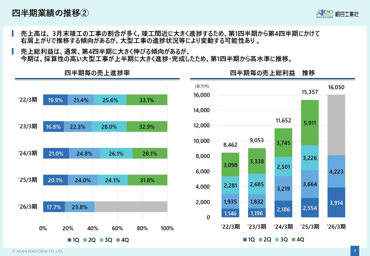 また、売上総利益についても、例年は第4四半期に大きく伸びる傾向がありますが、2026年3月期は採算性の高い大型工事が上半期に大きく進捗・完成したため、第1四半期から高水準で推移しています。