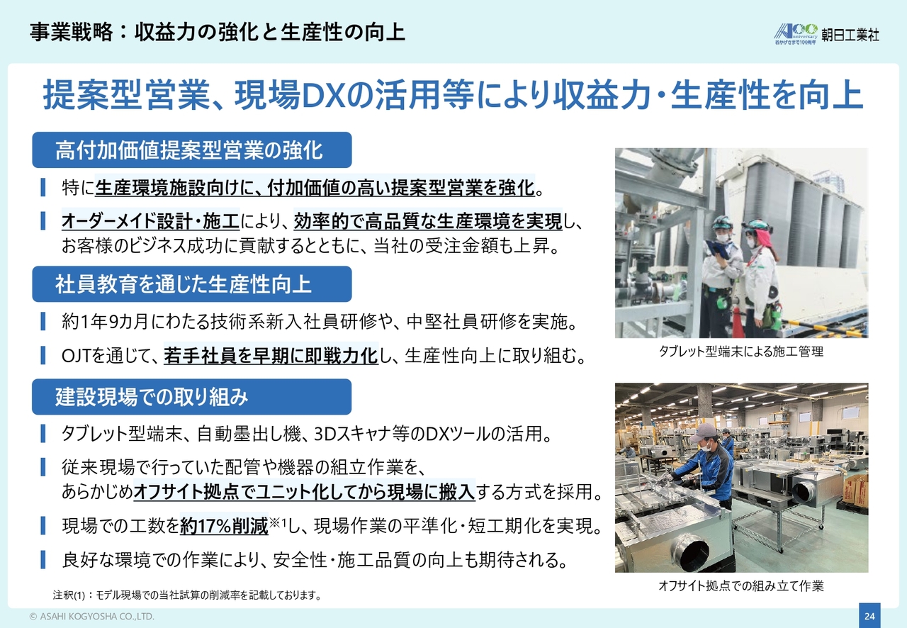 まず、事業戦略の取り組みについてご紹介します。弊社では収益力向上に向け、特に生産環境施設における提案型営業を強化しています。オーダーメイド設計・施工を通じ、お客さまに技術的付加価値の高い生産環境を提供することで、大型物件の受注拡大を目指しています。