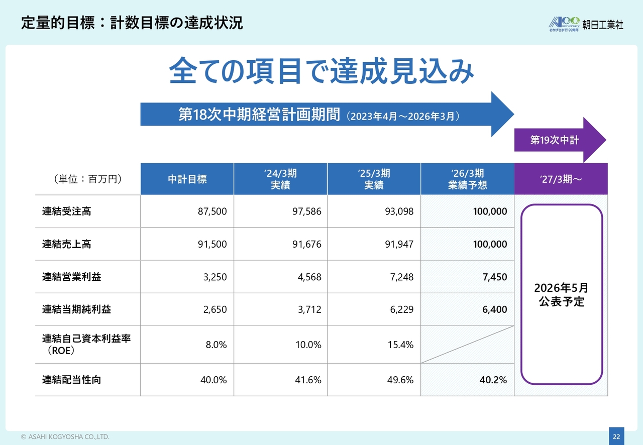 まず、第18次中期経営計画の主要計数目標の進捗状況についてご説明します。スライドの表は、中期経営計画の目標、これまでの実績、ならびに2026年3月期の業績予想を示したものです。