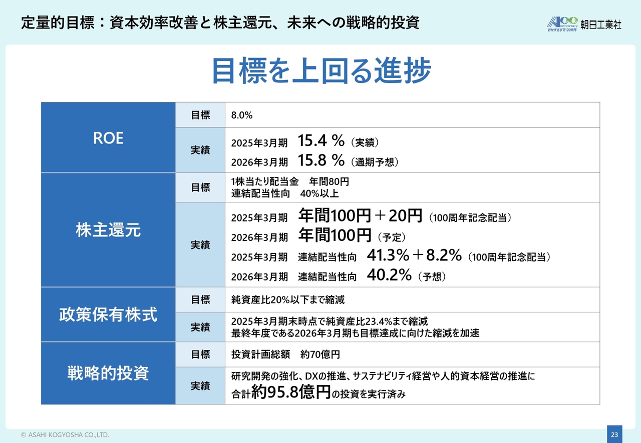 ROEについては、2025年3月期に15.4パーセントを達成し、今期2026年3月期の通期予想は15.8パーセントと、中期経営計画の最終年度目標である8パーセントを大幅に上回る見込みです。