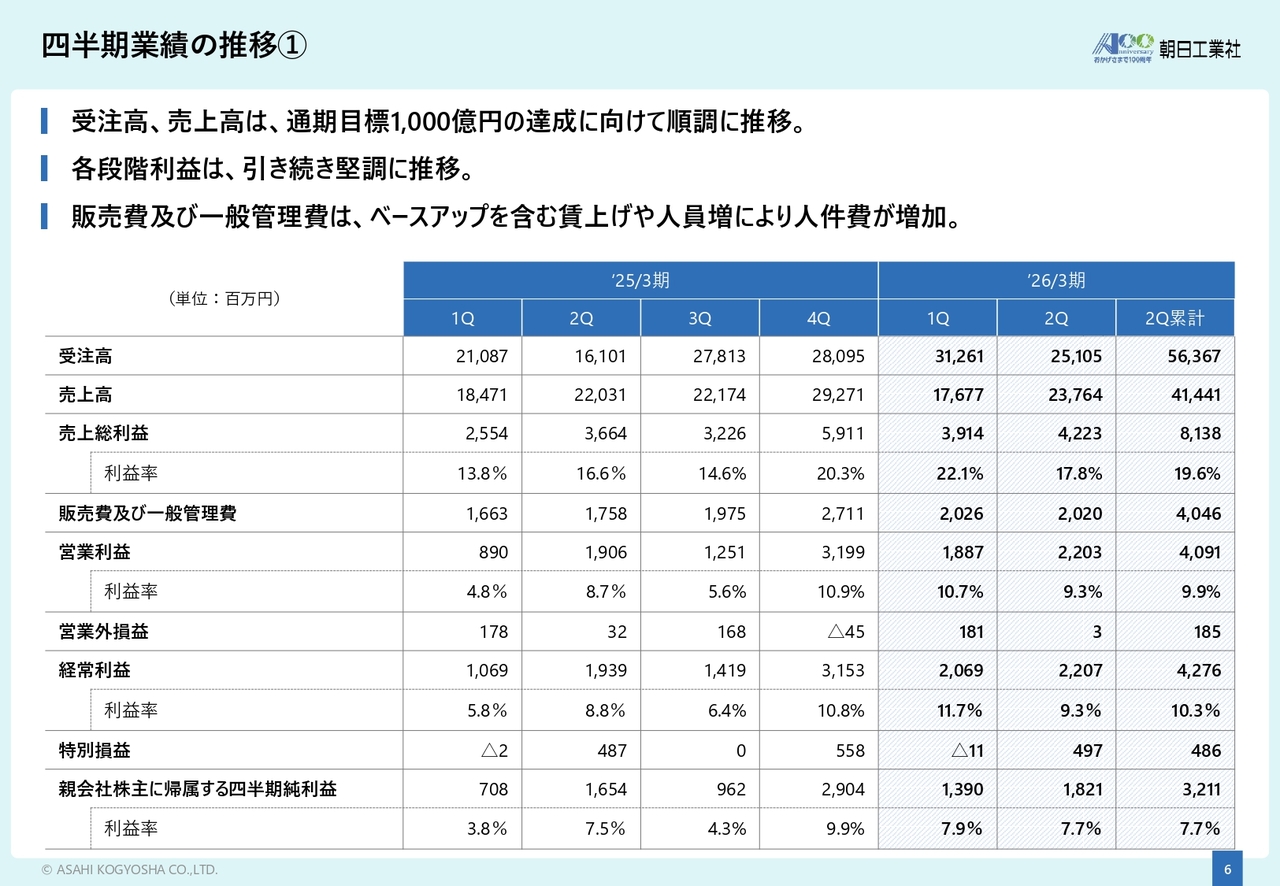 四半期業績の推移についてご説明します。受注高及び売上高については四半期ごとの目標は設定していませんが、通期目標である1,000億円の達成に向け順調に進捗しており、各段階利益も引き続き堅調に推移しています。