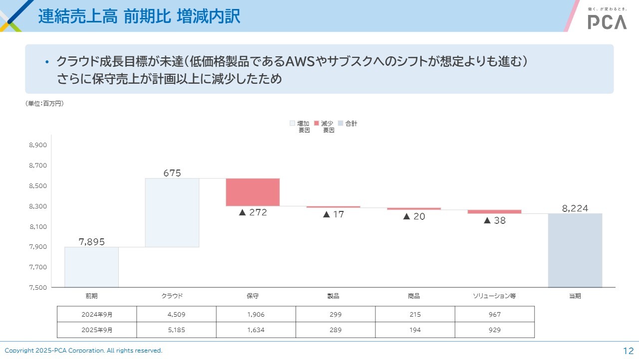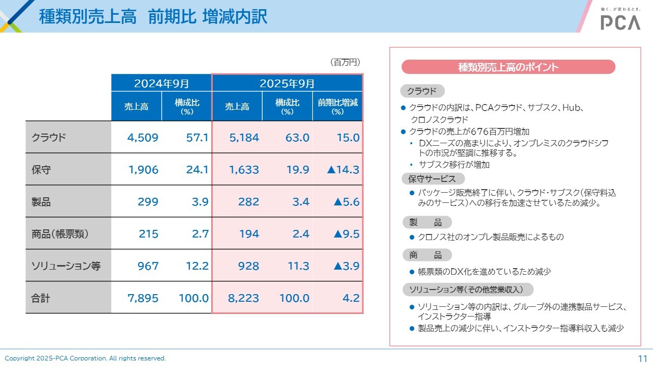 クラウドの伸びがやや弱い中で、保守が減少している状況です。保守が落ち込むのはパッケージ販売を終了したためであり、これは当然の結果ですが、それにより全体として4.1パーセントの成長にとどまったことが表れています。