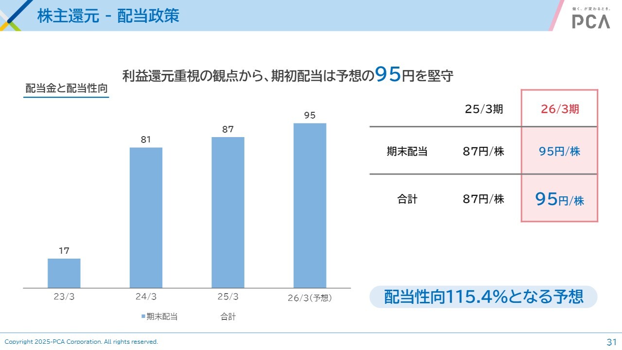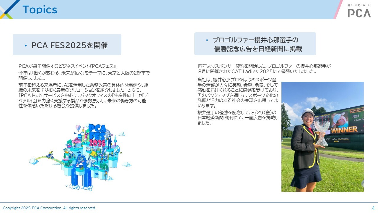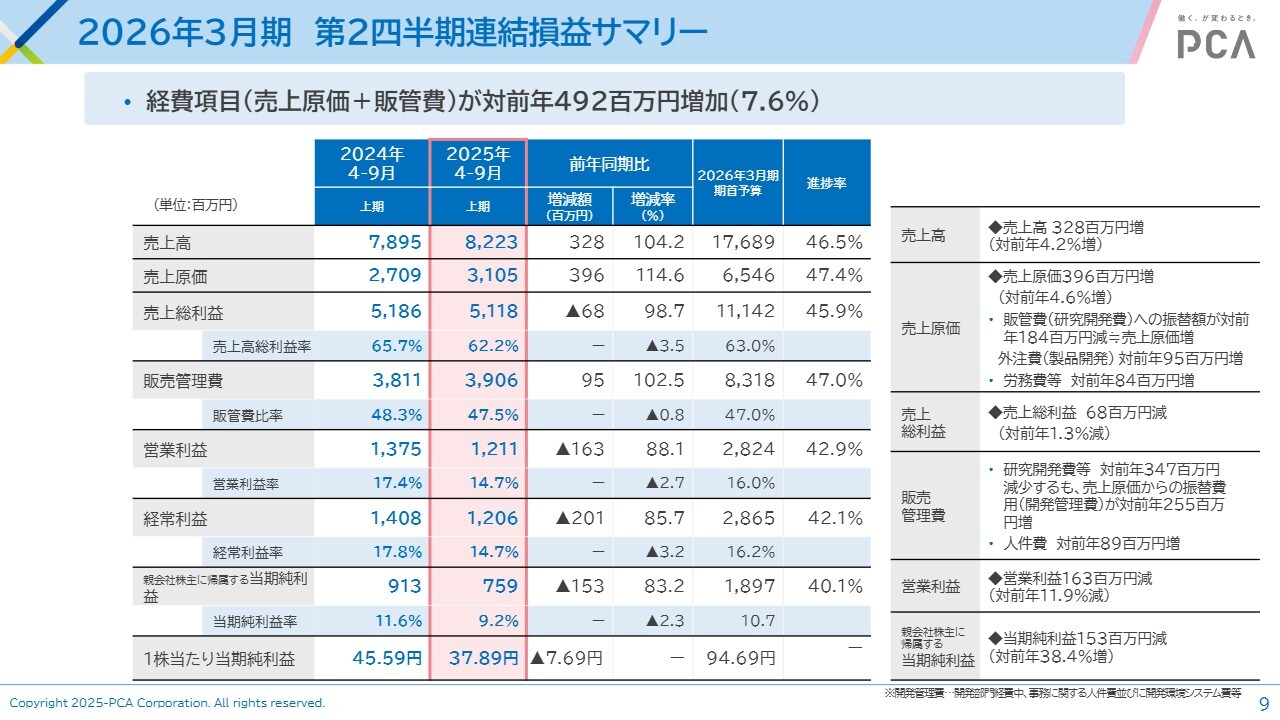 そのために経費を増加させるかじ取りをし、減益となる部分がありますが、ステークホルダーのみなさまにはこの方針をご理解いただき、引き続きピー・シー・エーを応援していただければ幸いです。