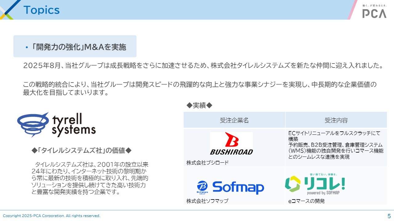 一方、実際の業務におけるトピックスとして、もう1つ大きな動きがありました。以前から当社の課題であった開発力の強化を目的に、M&Aを実施しました。今年8月に成長戦略をさらに加速させるため、開発会社として24年以上の実績を持つ株式会社タイレルシステムズを、新たにピー・シー・エーグループの仲間として迎えることができました。