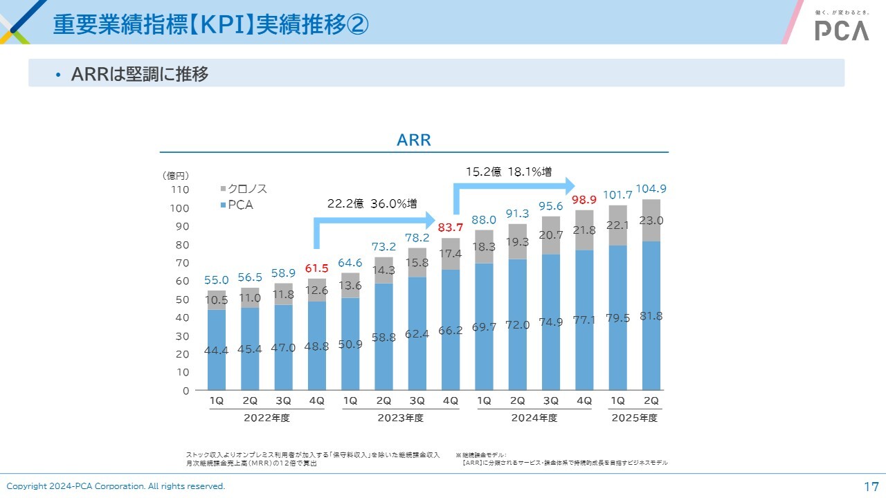 次にARR、つまり継続課金収入の金額についてですが、こちらも順調に推移しています。2023年度には価格改定効果があり、36.0パーセント増と大幅に増加しましたが、今回は18.1パーセント増となりました。価格改定効果は薄れつつありますが、2割近い増加を記録しており、これは決して低い数字ではないと理解しています。