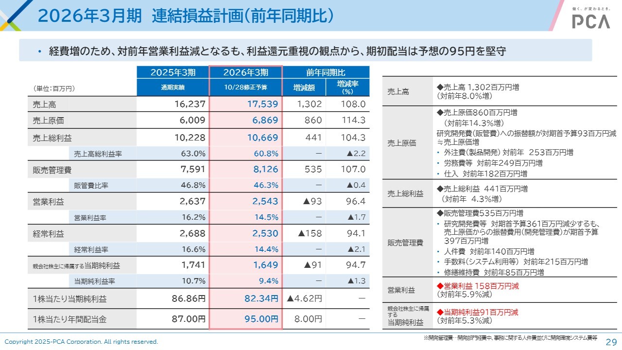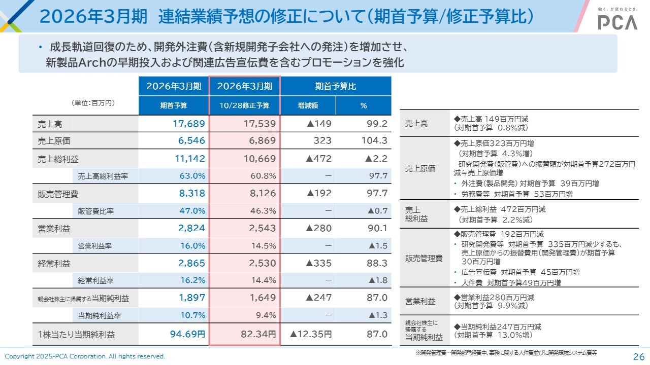 開発外注費については、M&Aした会社への発注も含めて増やしていく方針です。そして、11月27日にリリースを表明した新製品「PCA Arch」の早期投入を計画しています。
