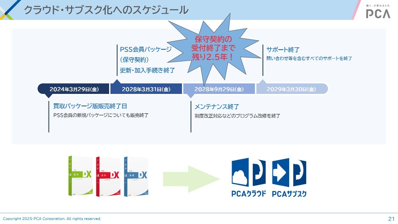 この2年半の間に、従来のパッケージをご利用中のお客さまや保守契約に加入いただいているお客さまには、ぜひ「PCAサブスク」や「PCAクラウド」への切り替えを行っていただき、当社の製品・サービスを継続的にご利用いただきたいと考えています。このため、当社では切り替えを促進するキャンペーンを実施していく予定です。