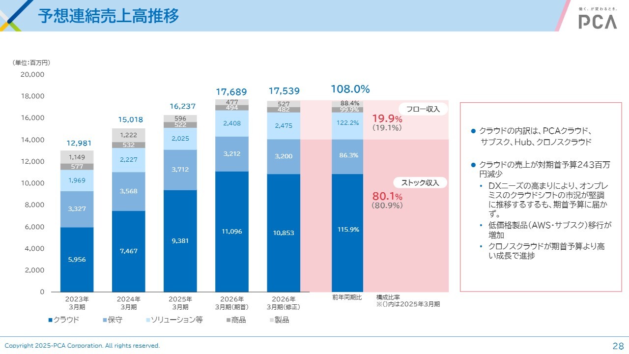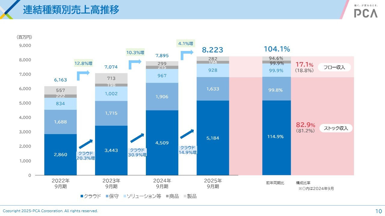 以前からクラウドや保守料を含めたストック収入を増やす方針を掲げており、実際、今期もこれらを合わせたストック収入が全体の8割以上となり、順調に成長しています。ただし、当社ではクラウドやサブスクリプションモデルへの転換を進めているため、あえてこの保守料を除いた指標を意識しています。