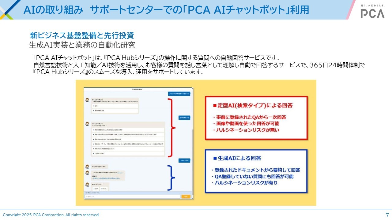 当社としては、まずAIについてはサポートセンターで「PCA AIチャットボット」として、実際には「PCA Hubシリーズ」の操作に関するご質問を自動回答する仕組みに活用しています。