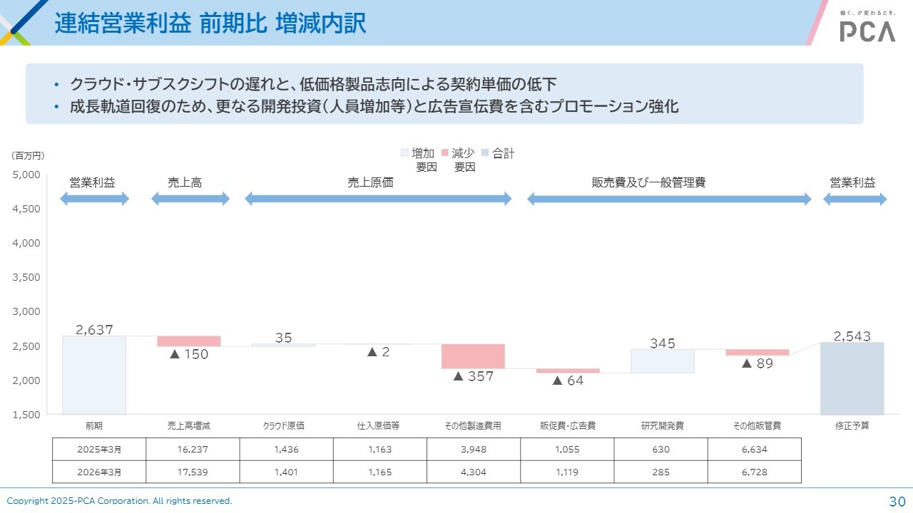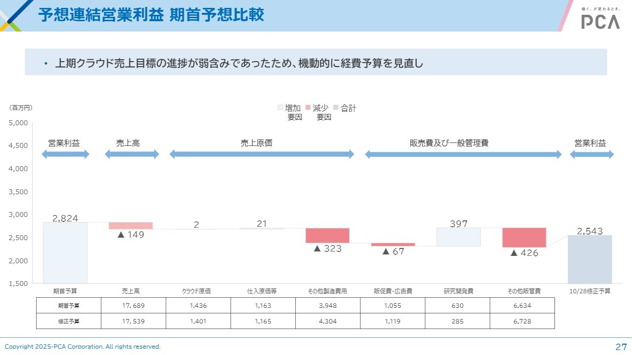 こちらについては再三お伝えしていますが、再成長を図るために経費を積極的に投入し、成長率を取り戻す方針を採っています。そのため、あえて減益予算に修正した点については、みなさまにご理解いただければと思います。