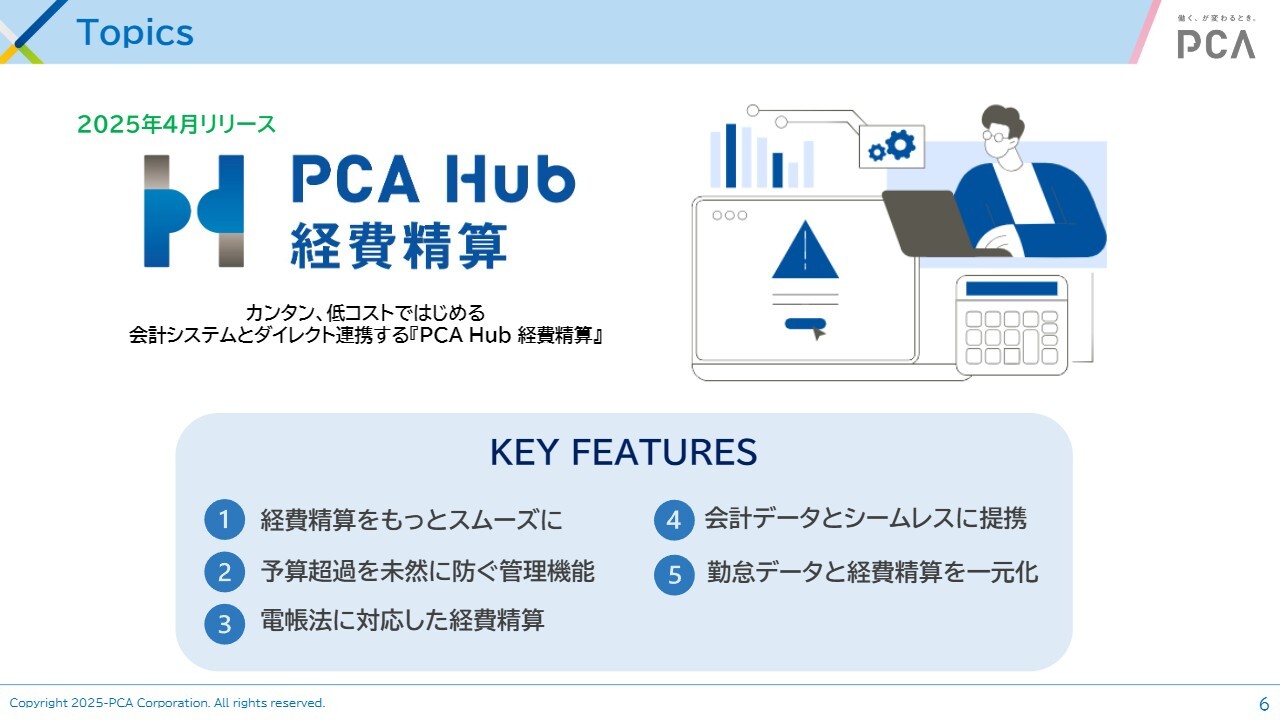 製品・サービスについてですが、今年の期初、4月に「PCA Hub経費精算」をリリースしました。これは、以前から強化を進めているHR分野のサービス拡充の一環です。