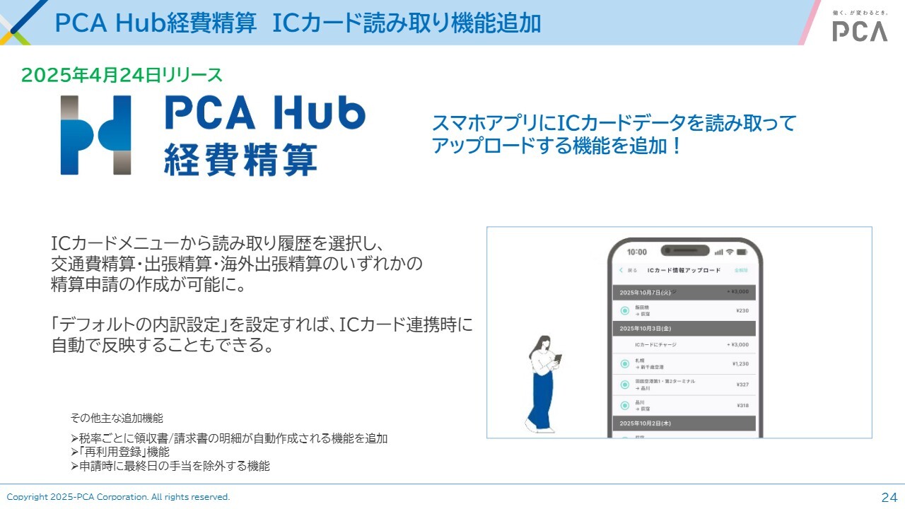 このたび、「PCA Hub経費精算」について、10月20日にICカード対応が可能となり、利便性がさらに向上しました。ぜひみなさまにもご利用・ご活用いただければと思います。