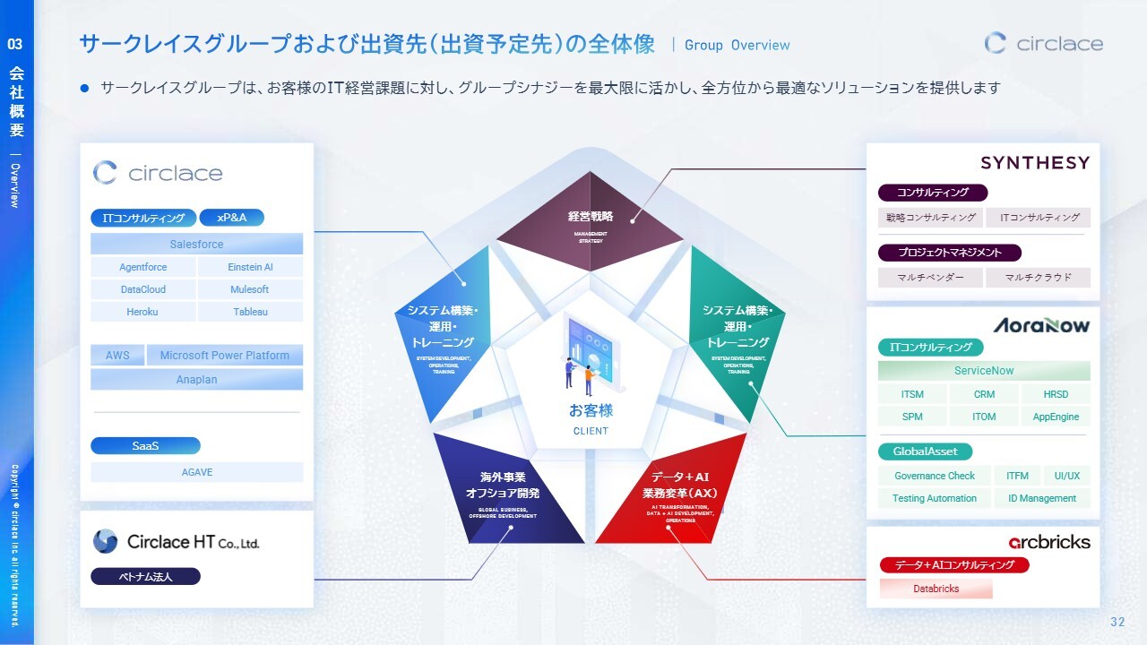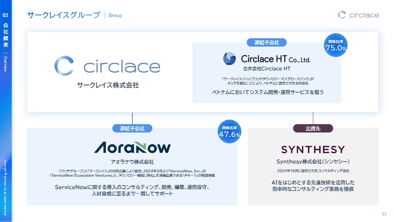 サークレイスグループの構成についてご説明します。当社グループは、2社の連結子会社を有しています。ベトナムでシステム開発・運用サービスを行う「Circlace HT」、および「ServiceNow」に関する導入コンサルティング、開発、構築、運用保守、人材育成を一貫してサポートする「アオラナウ株式会社」です。
