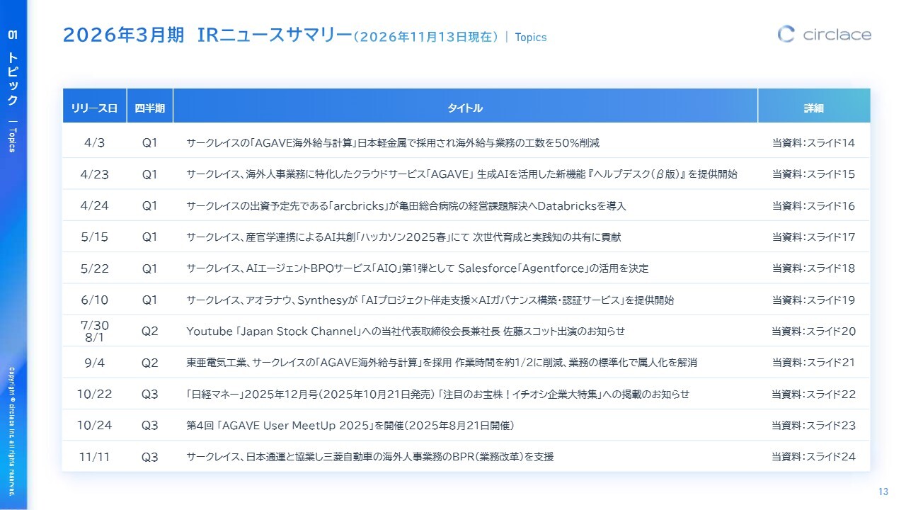 2026年3月期のIRニュースの概要です。本動画では、前回8月の決算発表以降のリリースについてご説明します。