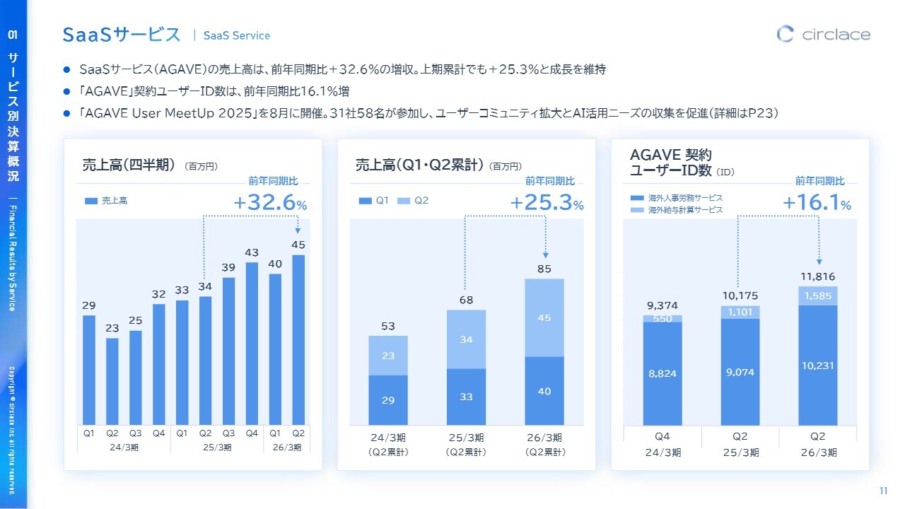 SaaSサービス「AGAVE」についてご説明します。「AGAVE」の売上高は前年同期比32.6パーセント増、上期累計では25.3パーセント増と、成長を維持しています。「AGAVE」の契約ユーザーID数は前年同期比16.1パーセント増となりました。