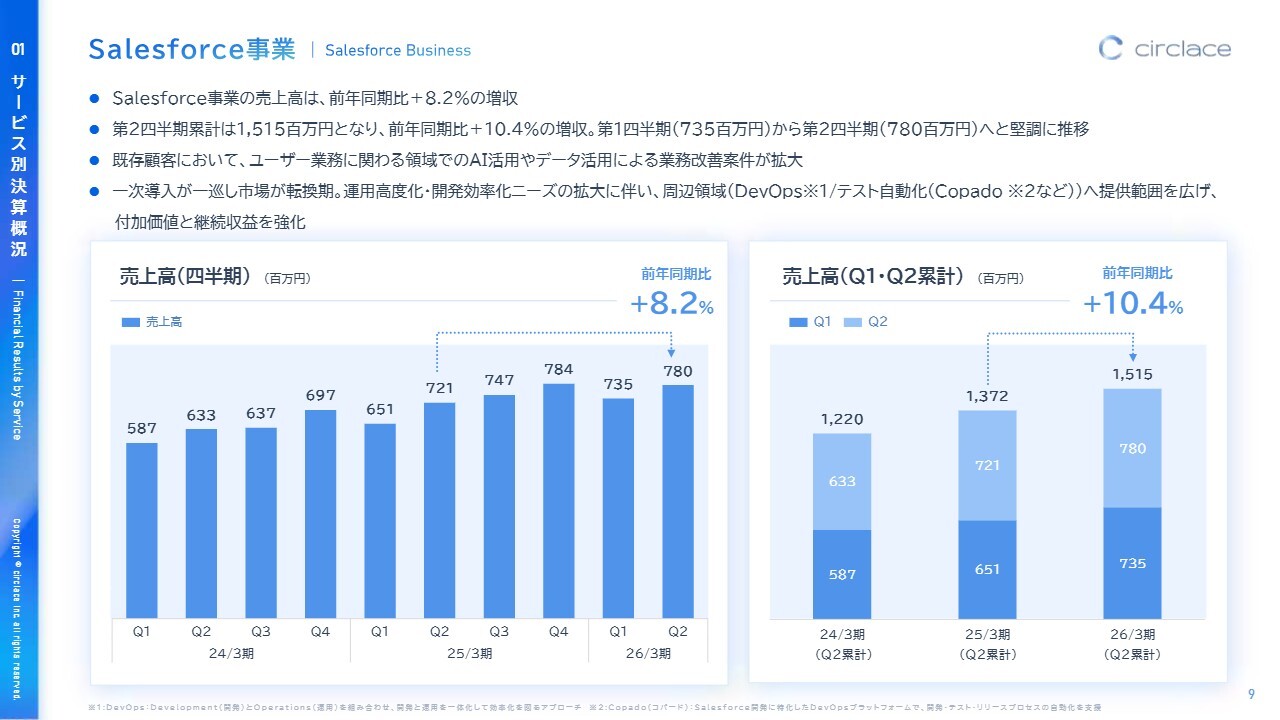 Salesforce事業の概況についてご説明します。Salesforce事業の売上高は前年同期比8.2パーセント増となりました。第2四半期までの6ヶ月累計では15億1,500万円となり、前年同期比10.4パーセント増となっています。第1四半期から第2四半期にかけては、堅調に増加の傾向を維持しています。