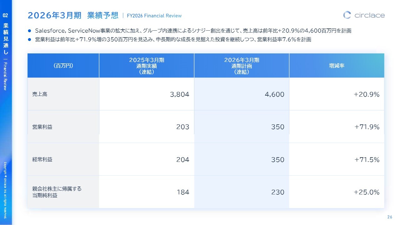 Salesforce事業およびServiceNow事業の拡大に加え、グループ内連携によるシナジー創出を通じて、売上高は前年比20.9パーセント増の46億円を計画しています。営業利益は前年比71.9パーセント増の3億5,000万円を見込み、中長期的な成長を見据えた投資を継続しながら、営業利益率7.6パーセントを計画しています。売上高・営業利益ともに順調に推移しており、変更はありません。