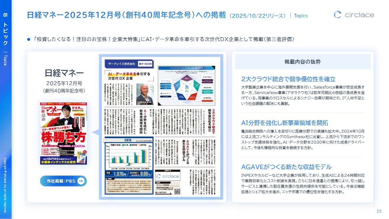 このたび、『日経マネー』の誌面において、「投資したくなる! 注目のお宝株! 企業大特集」にAIおよびデータ革命を牽引する次世代DX企業として当社が掲載されました。本号は現在も書店に並んでいますので、ぜひお手に取ってご覧いただければ幸いです。