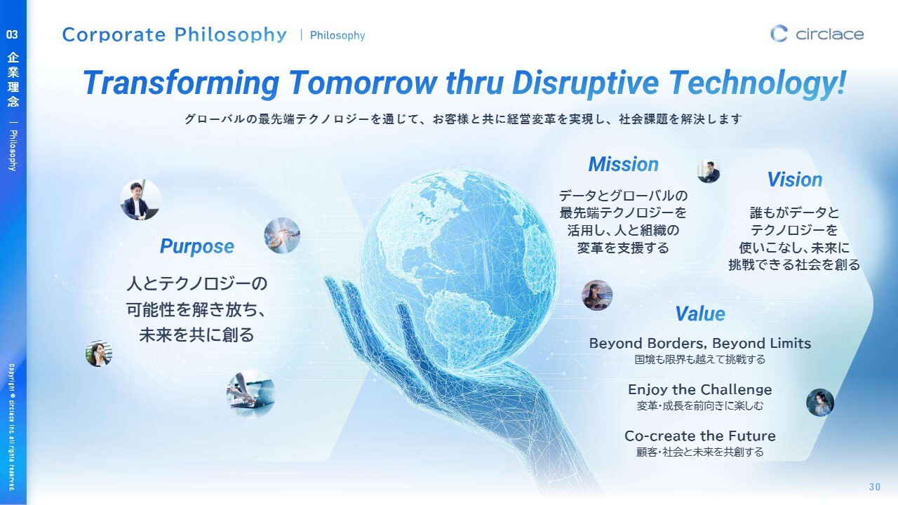 当社は今年、企業理念を刷新し、「Transforming Tomorrow thru Disruptive Technology!」を企業理念として掲げました。グローバルの最先端テクノロジーを通じて、お客さまとともに経営変革を実現し、社会課題の解決に挑んでいきます。
