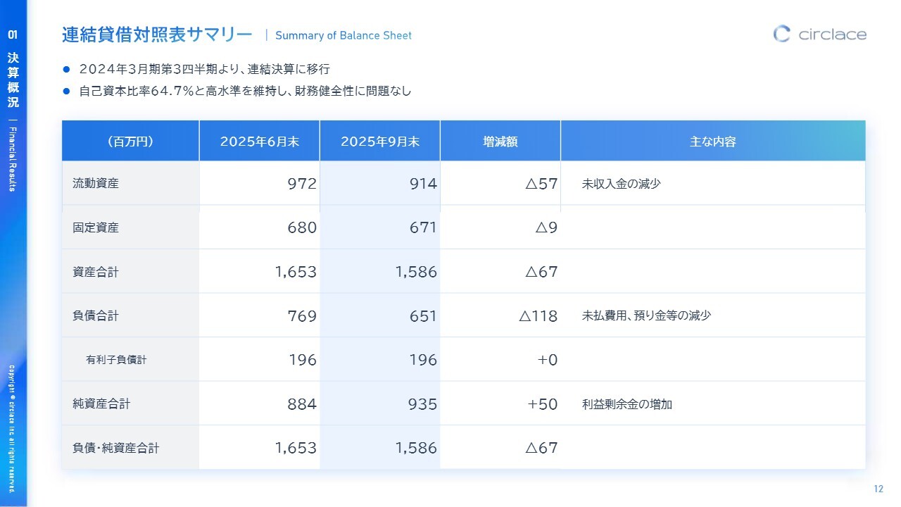 連結貸借対照表のサマリーです。9月末時点で、自己資本比率は64.7パーセントと引き続き高い水準を維持しており、財務健全性に問題はありません。