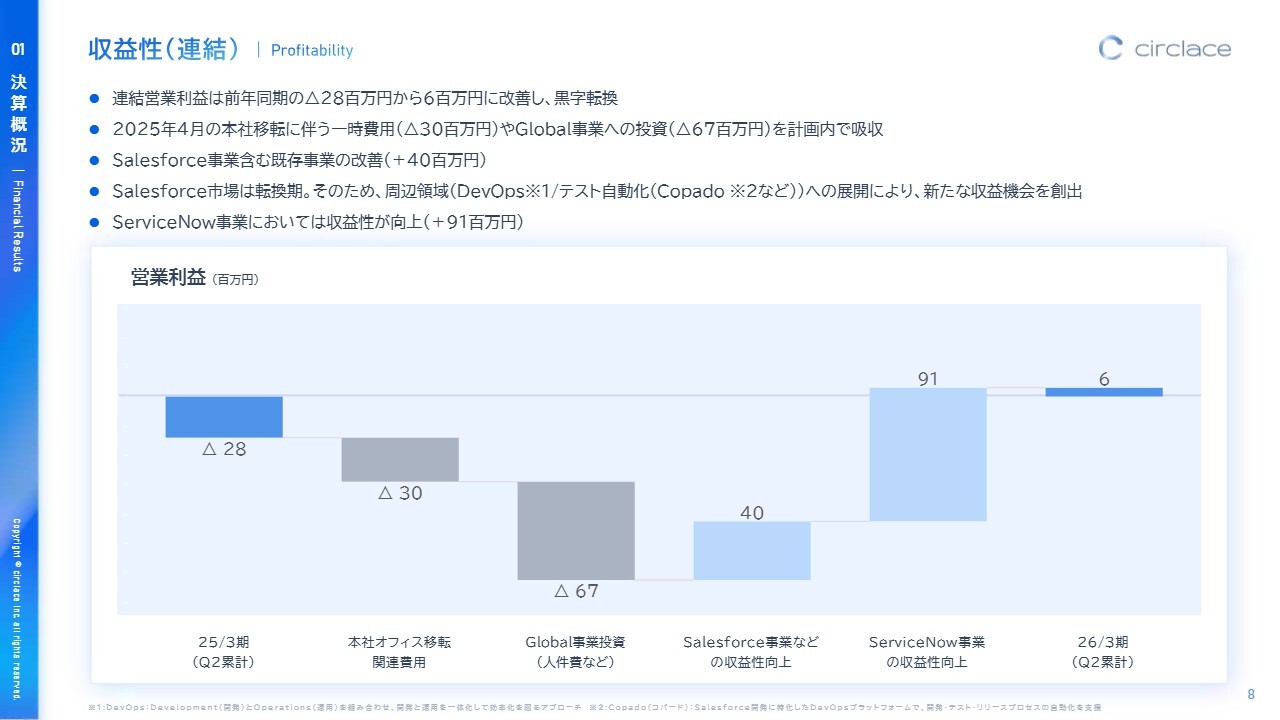 連結ベースでの収益性についてご説明します。今期6ヶ月間における連結の営業利益は、前年同期のマイナス2,800万円から黒字転換し、プラス600万円に改善しました。2025年4月に実施した本社移転に伴う一時費用3,000万円、およびグローバル事業への投資6,700万円を吸収した上での結果です。