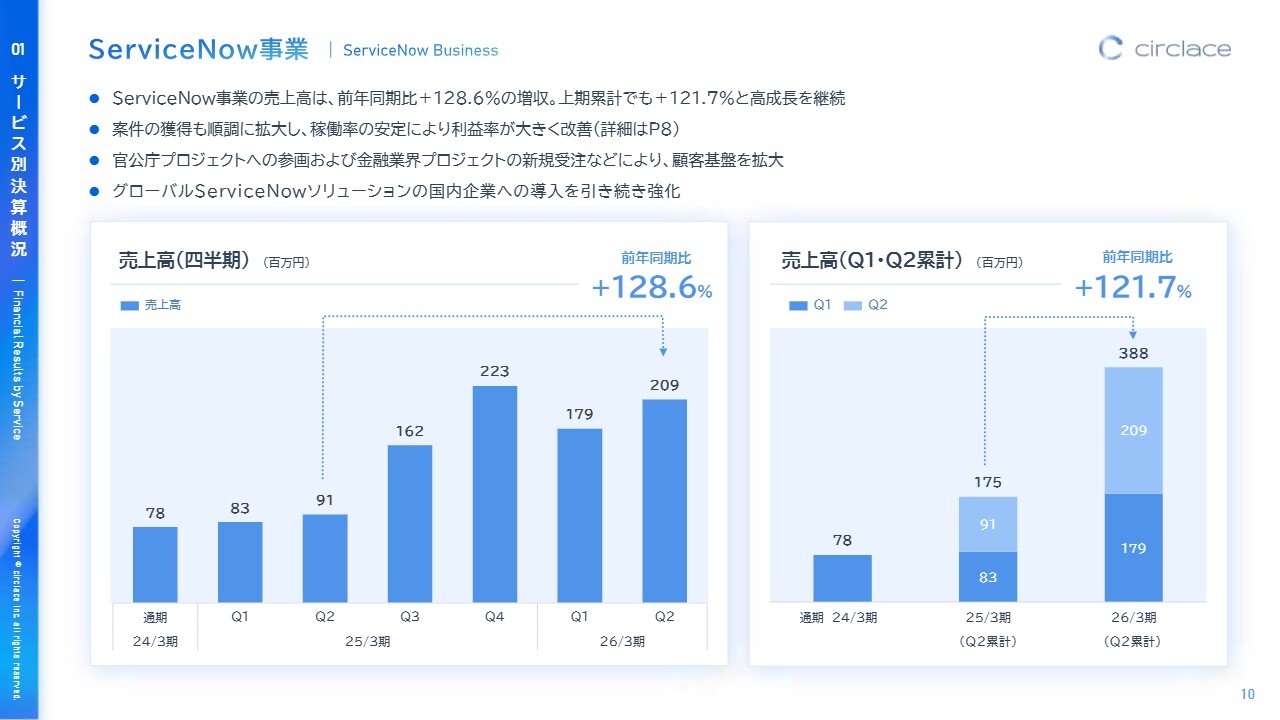 ServiceNow事業の概況についてご説明します。ServiceNow事業の売上高は、前年同期比128.6パーセント増となり、前年から2倍以上の成長を達成しました。上期の累計でも121.7パーセント増と、高い成長を示しています。