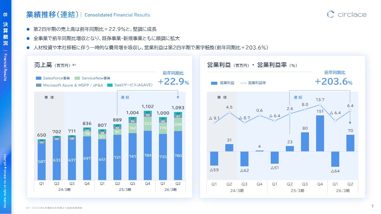 連結ベースでの業績推移についてご説明します。第2四半期の売上高は前年同期比22.9パーセント増となり、堅調に成長しています。全事業において前年同期と比較して増収となり、既存事業・新規事業ともに順調に拡大しています。