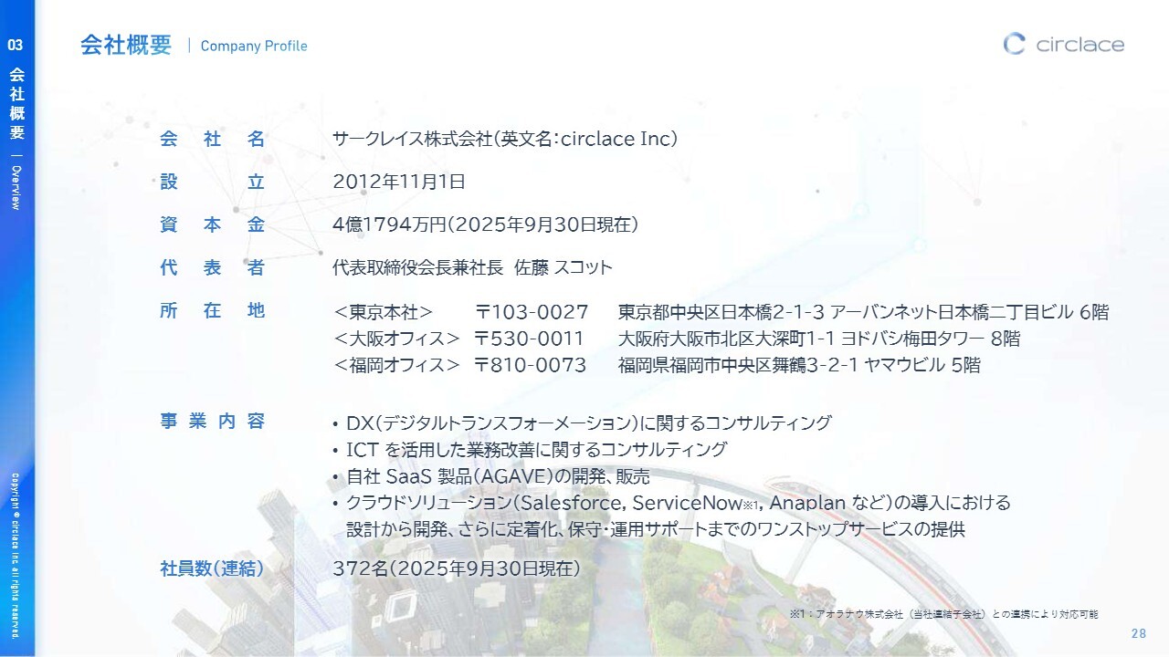 サークレイス株式会社は、2012年11月に設立されました。DXに関するコンサルティング、ICTを活用した業務改善に関するコンサルティングを行い、自社SaaS製品「AGAVE」の開発・販売、「Salesforce」「ServiceNow」「Anaplan」などのクラウドソリューションの導入における設計から開発、定着化および保守・運用サポートまで、ワンストップサービスを提供しています。